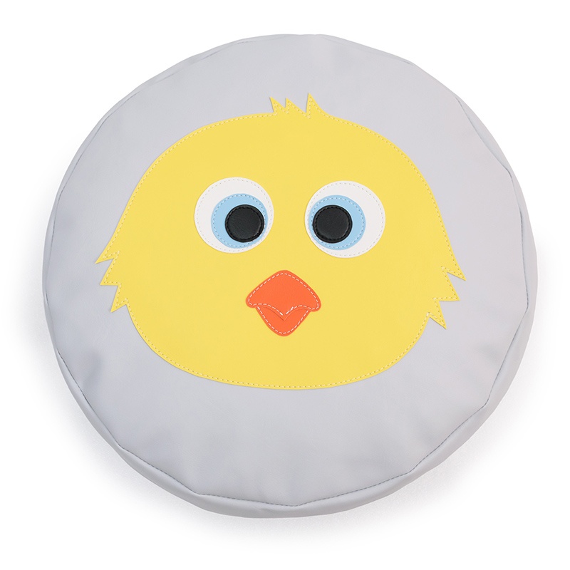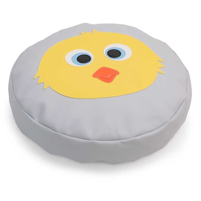 Almofada com figura costurada, fabricada em tela lavável e impermeável e interior em espuma triturada.