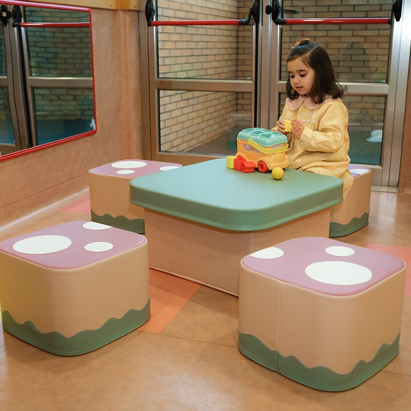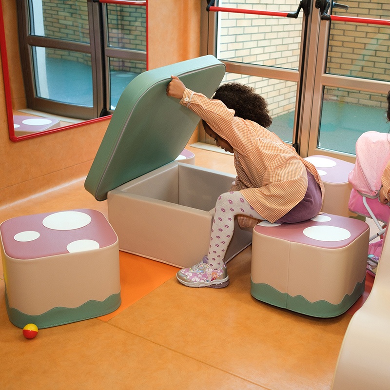 Conjunto composto por uma mesa com tampo de abrir e compartimento para arrumação de brinquedos; 4 bancos cogumelo com figuras costuradas, em tela lavável e impermeável e interior em espuma.